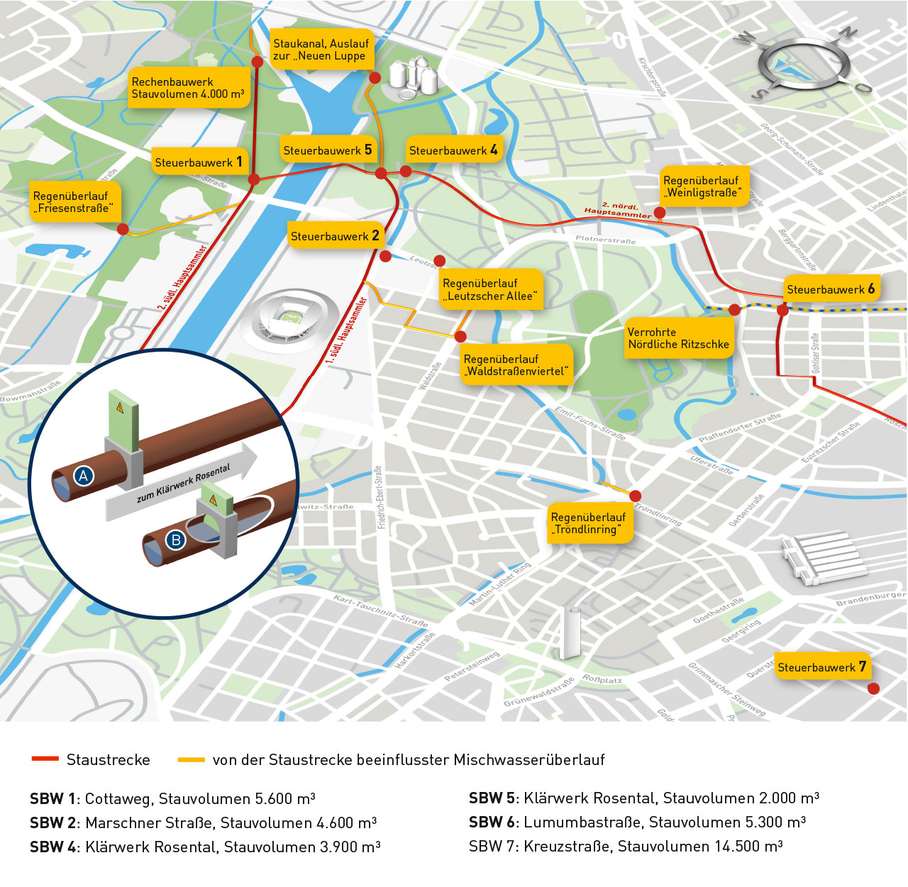 Um den Stauraum der bis zu 3 Meter breiten und 2,50 Meter hohen Kanäle zum Klärwerk Rosental zu nutzen, wurden die Hauptsammler mit Steuerbauwerken (SBW) ausgerüstet. Auch in den weiter entfernten Netzbereichen kann mit zusätzlichen Steuerbauwerken mehr Stauvolumen aktiviert werden.