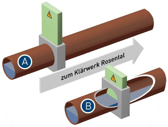 Fall A: Der Schieber ist voll geöffnet, das Abwasser fließt ungehindert zum Klärwerk Rosental.